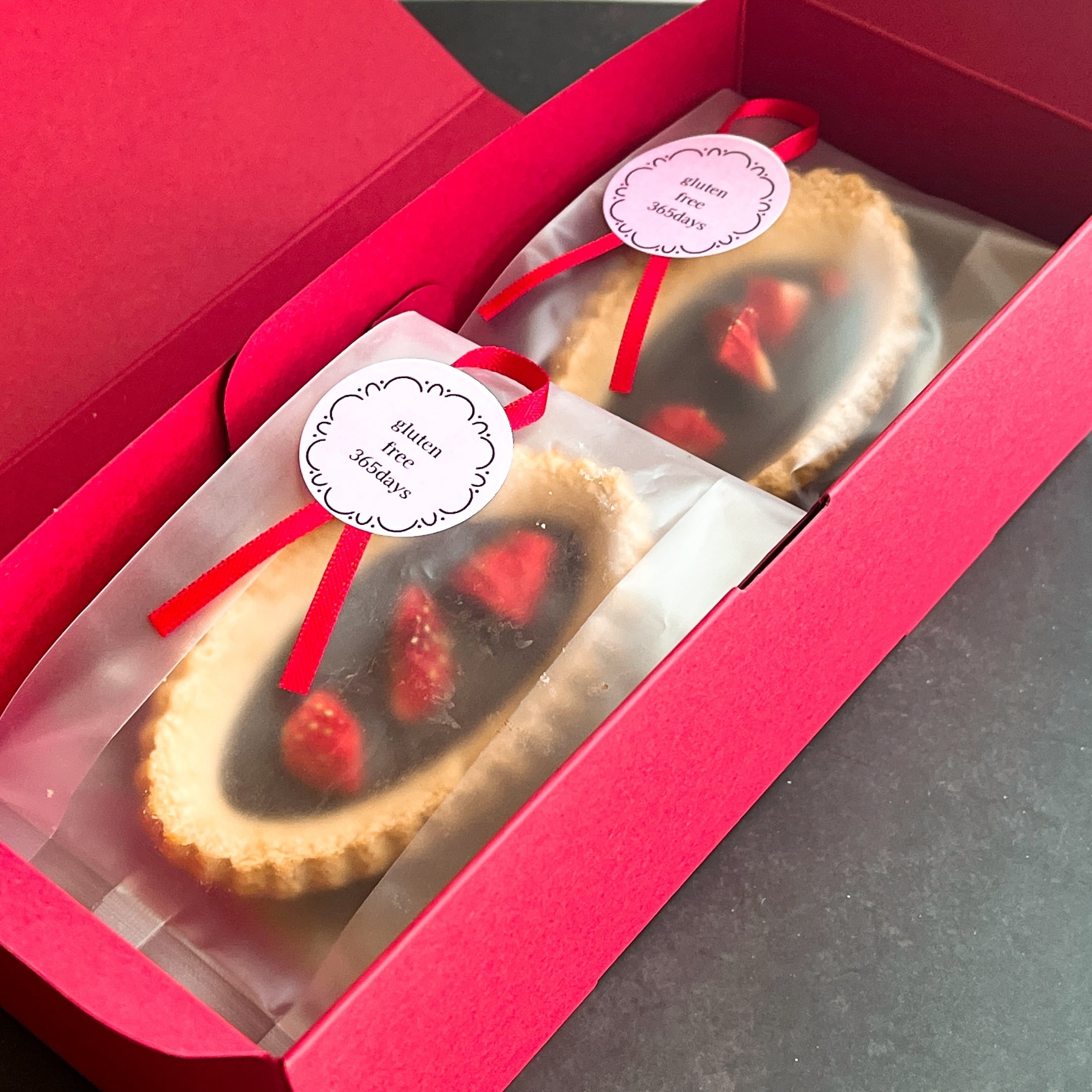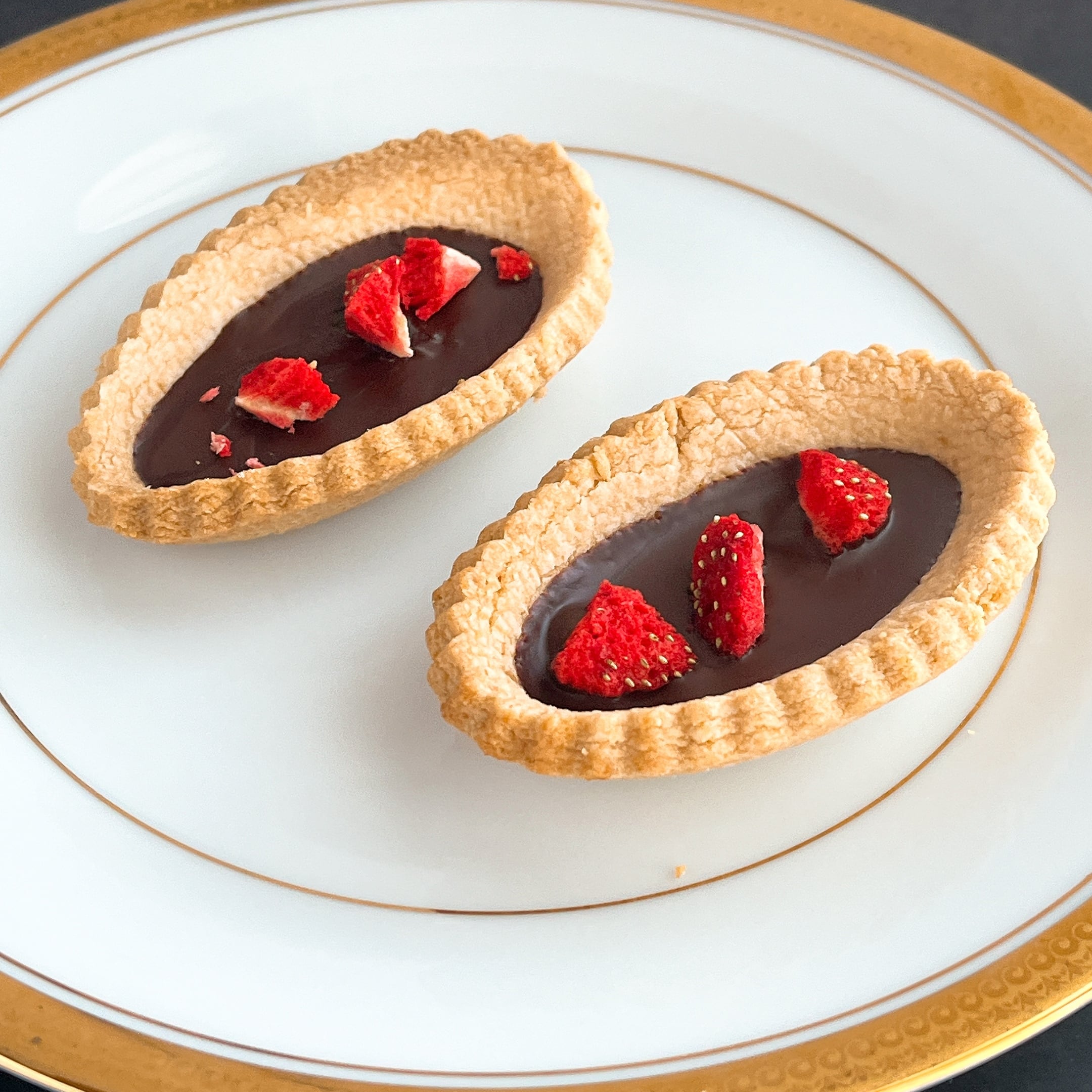 定番のグルテンフリープレーンクッキー生地のタルトに、乳化剤・香料不使用のオーガニックチョコレートと砂糖・油・添加物不使用のドライストロベリーを合わせたプレミアムなグルテンフリーのショコラタルト。